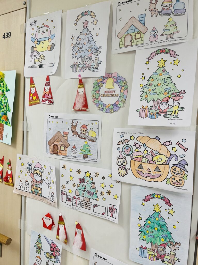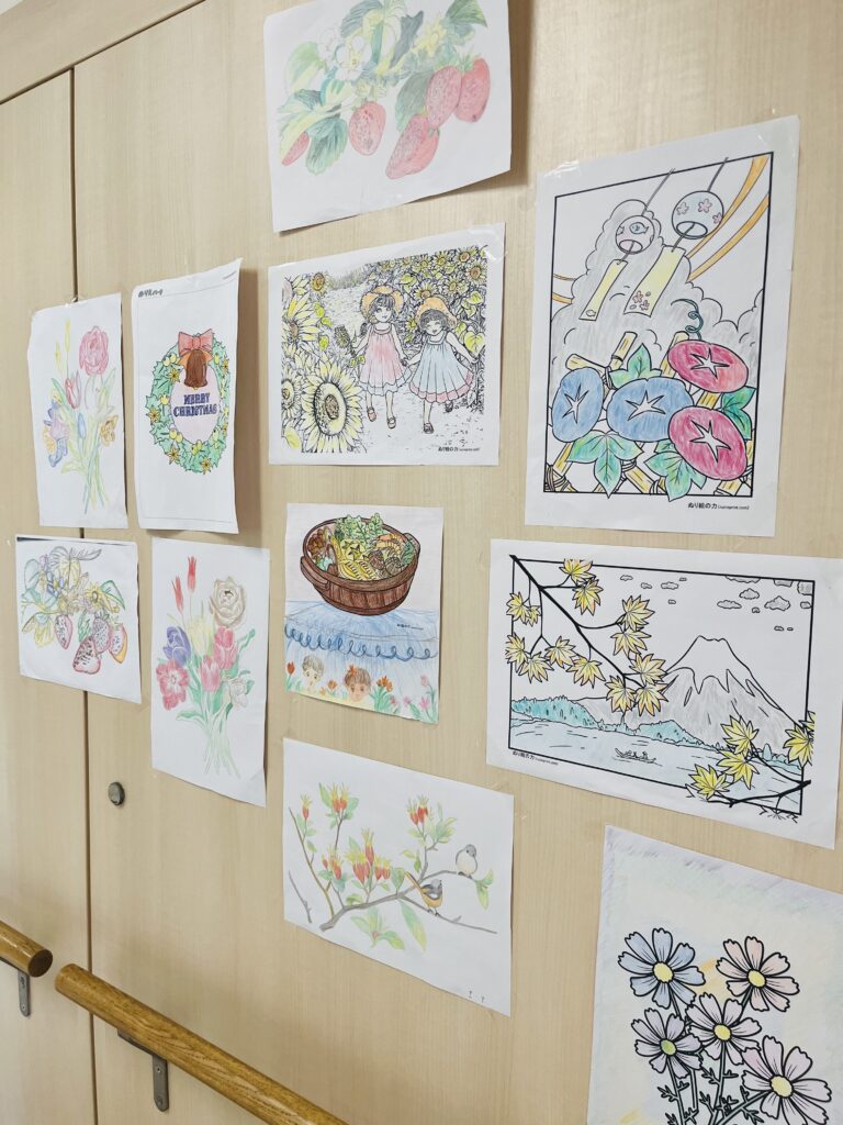 塗り絵や作品を季節ごとに飾っています🎨🌼